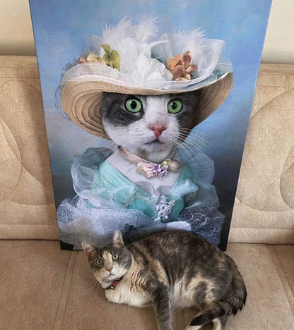 Draped in sumptuous fabrics, lace collars, and delicate flourishes, this portrait evokes the genteel sophistication of Georgian and Regency-era painting, each detail thoughtfully designed to reflect your pet’s refined character.